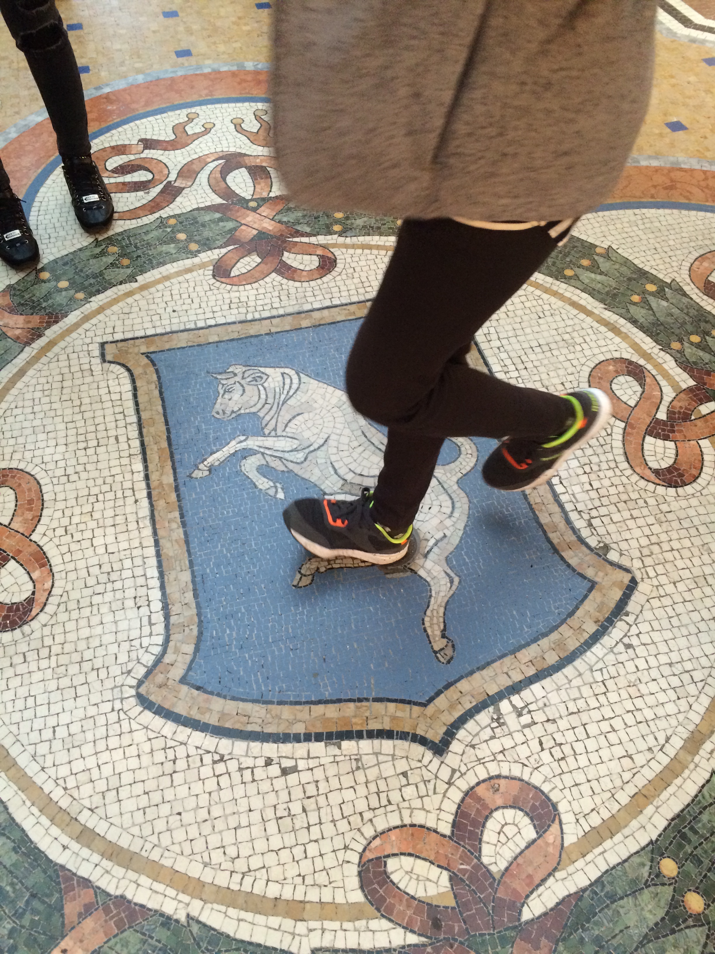 쇼핑몰 중앙 돔 아래에 로마와 피렌체, 토리노, 밀라노를 상징하는 늑대, 백합, 황소, 십자 모자이크가 있습니다.